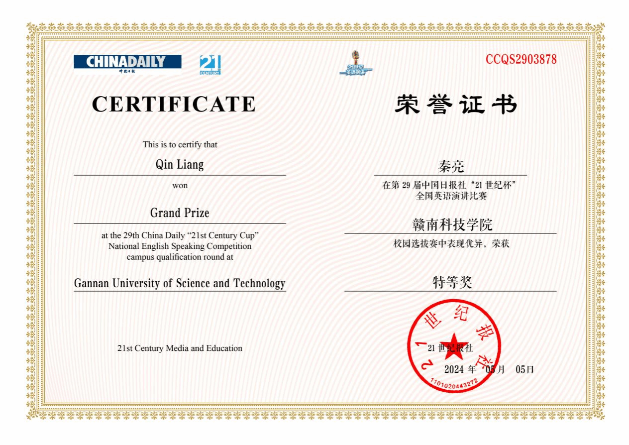 本次校园赛以个人方式进行,选手根据已备演讲主题自拟题目,完成一篇演讲稿,并模拟现场演讲进行录像在比赛官方网站上传个人演讲作品,评委根据作品质量,从高分到低分依次取特等奖2名,一、二、三等奖若干名。最终,来自自动化222的秦亮,英语222班的邹婧乐2位选手获得特等奖并顺利晋级地区决赛。