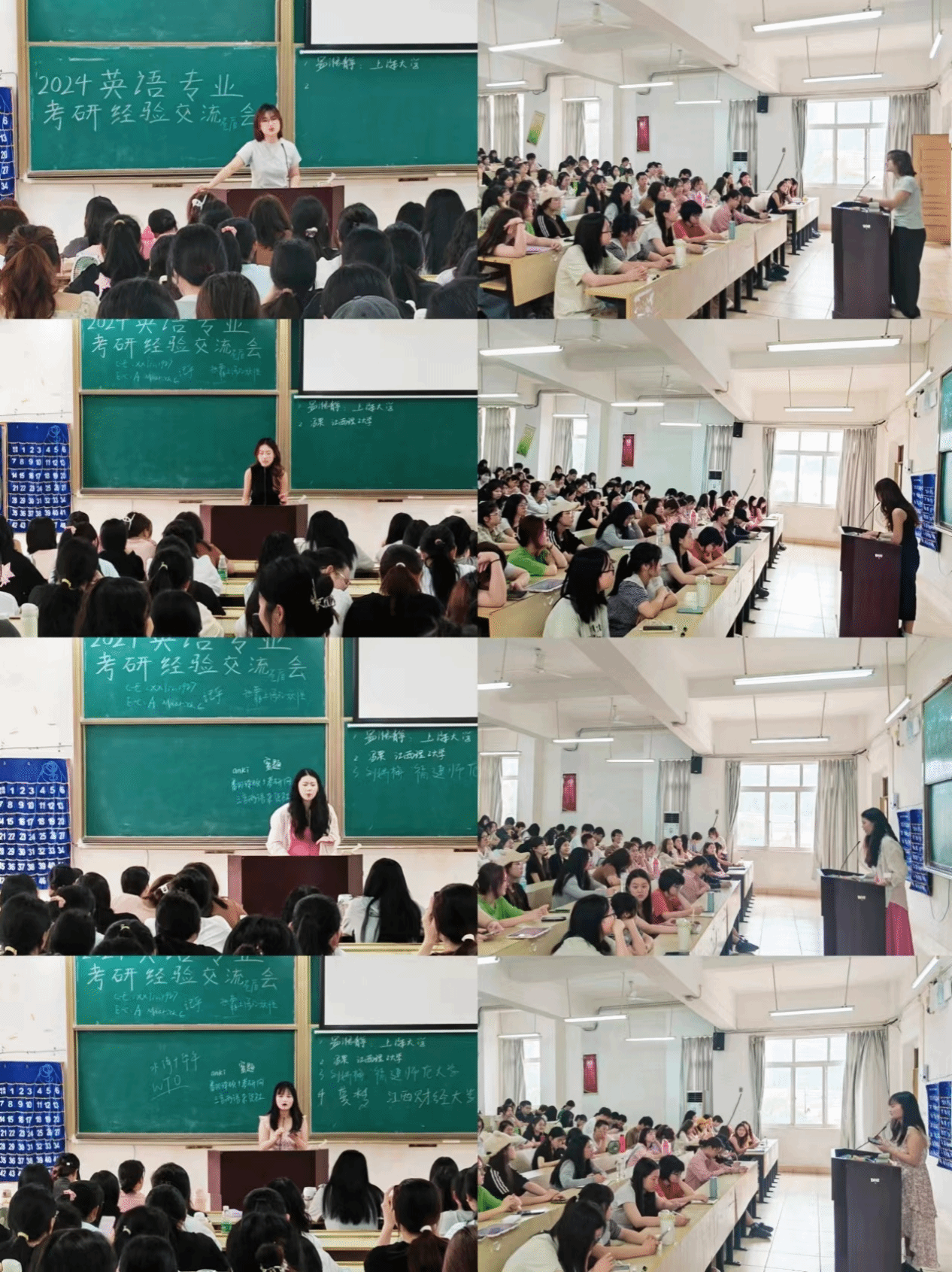 活动伊始,英语教研室主任顾玲老师上台致辞,对到场的同学们表示热烈的欢迎,并简要介绍了本次交流会的意义与目的。随后,8名优秀学子依次上台,围绕“个人基本情况”“择校策略”“备考经验”以及“美好祝愿”四大主题,向现场同学们进行了精彩纷呈的分享。