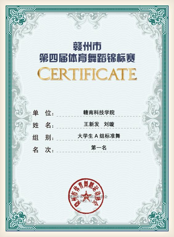 近日,2022年第四届赣州市体育舞蹈锦标赛比赛成绩揭晓,公司体育舞蹈队在获得了江西省运动会体育舞蹈项目历史性突破后又在赣州市第四届体育舞蹈锦标赛中捷报频传,在朱少刚老师的指导下取得了一等奖20项、二等奖6项的好成绩。其中社体212班林家威与社体201班刘旺弟搭档拿下华尔兹、探戈和狐步舞3个组别的冠军,在省运会获得两枚金牌的邬凯锋/钟越搭档拿下快步舞和维也纳华尔兹冠军,另一对搭档,社体212班王新发与刘璇配合取得老员工标准舞A组和B组两项冠军,另外,设计223班罗文慧同学表现抢眼,取得了拉丁舞女子组伦巴、恰恰两个项目的第一名。